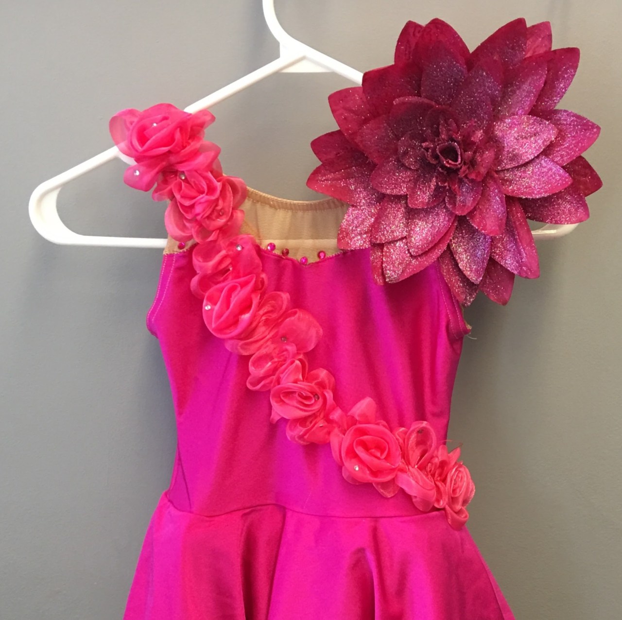The headpiece (seen above clipped onto the shoulder) was based on a dahlia flower. The garland was made to look like roses. The upper skirt had six petals shaped like a lily. The bottom skirt was inspired by a carnation’s petals with their many folds and layers.