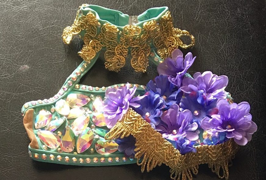 We added purple, blue, and indigo flowers among the jewels. We chose flowers whose colours reflected the tones in the ombre skirt. This was one of our favourite costumes we made for this year’s solos.