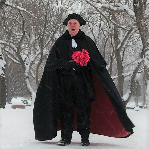 We created the costume to fit within the 1780’s time period. The dark cloak and tricorn hat were typically worn by men of that period and made for a dramatic contrast against the snow.